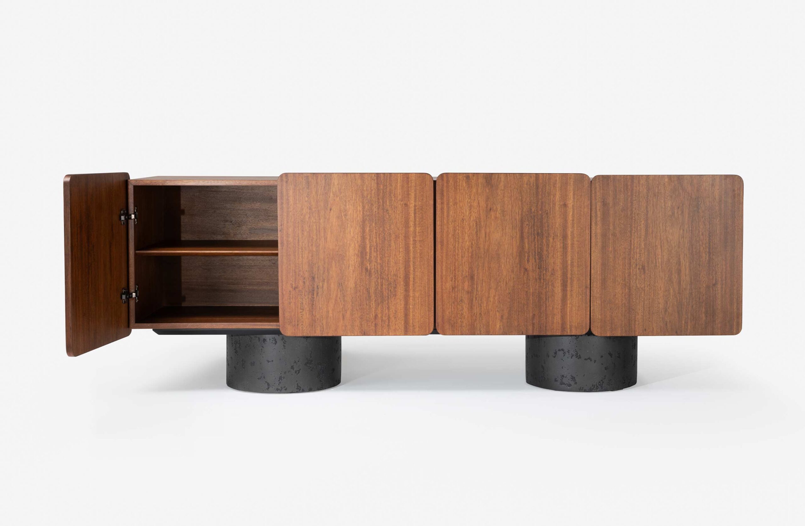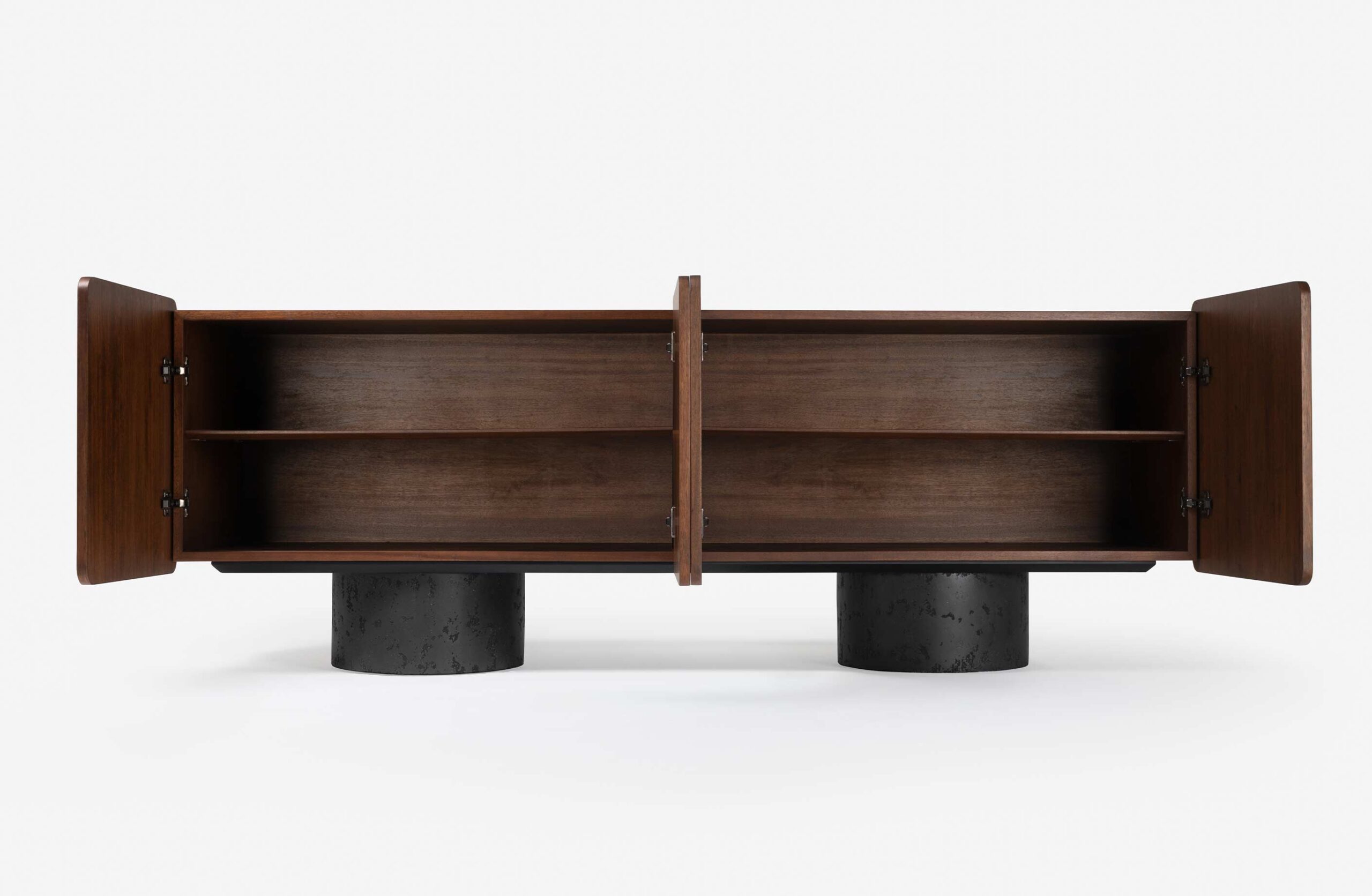 O buffet Path destaca-se pela pureza das formas e pelo contraste de materiais. Os volumes em madeira de cantos suaves repousam sobre bases cilíndricas com textura, resultando em uma peça de presença marcante e equilíbrio visual. Disponível em três tamanhos com múltiplos acabamentos.