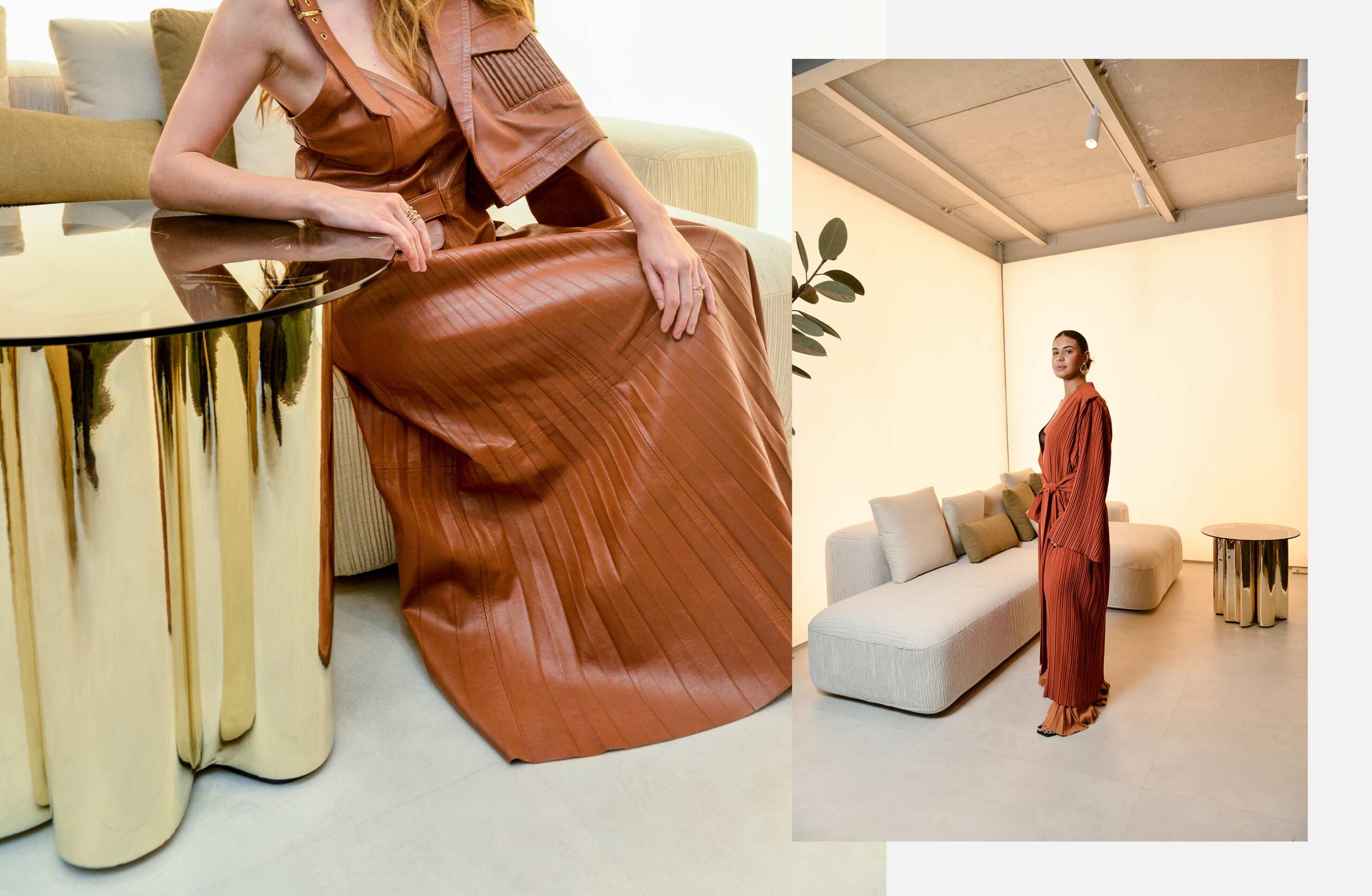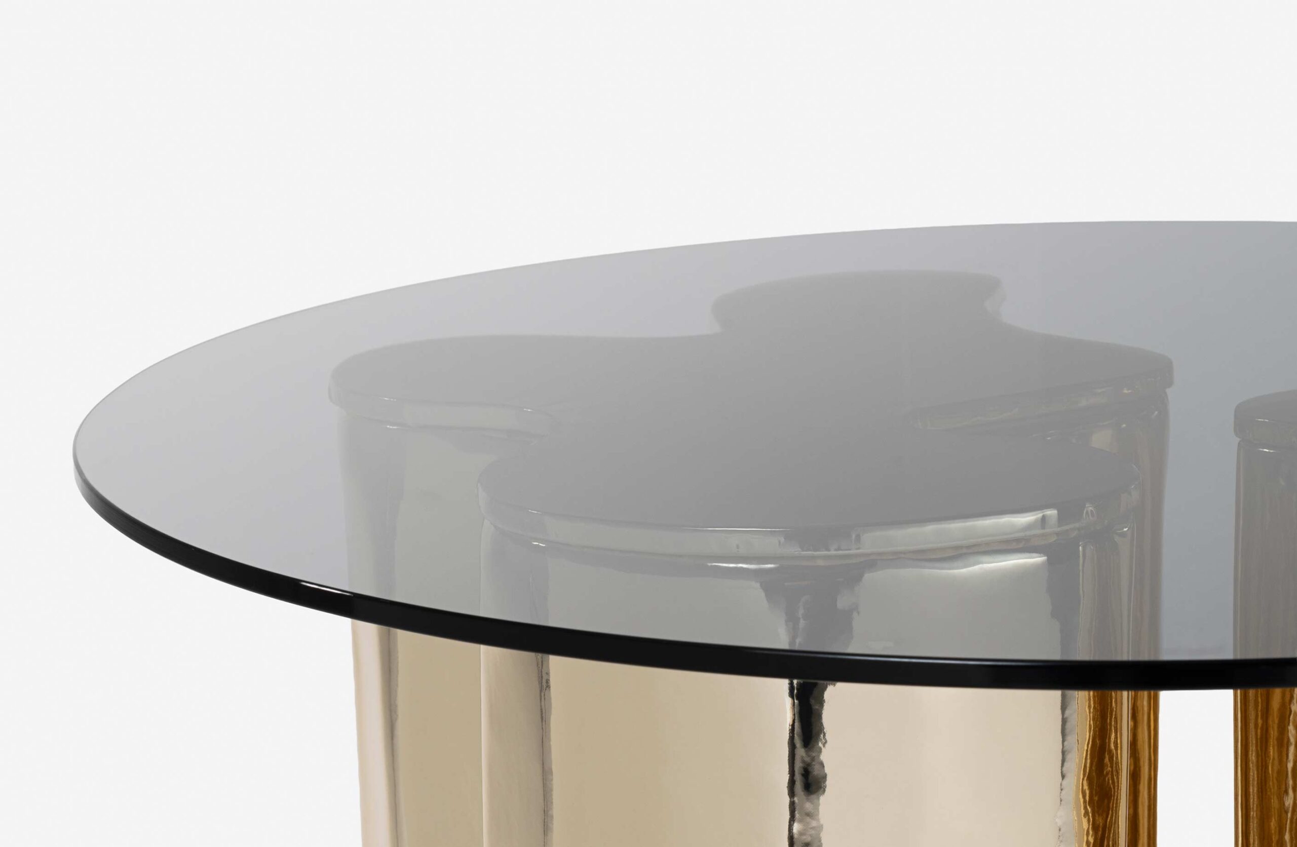 A mesa lateral Boreal se destaca por sua presença escultórica e acabamento refinado. Seu tampo em vidro fumê revela, com sutileza, a base sinuosa em tecido espelhado dourado, que reflete a luz e o ambiente ao redor. A estrutura orgânica e fluida da base contrasta com a superfície plana e translúcida do tampo, criando um jogo visual dinâmico entre forma, brilho e transparência. Com um design expressivo, a Boreal é uma peça de destaque, ideal para composições contemporâneas que valorizam arte e funcionalidade. Disponível em tamanho único com múltiplos acabamentos.