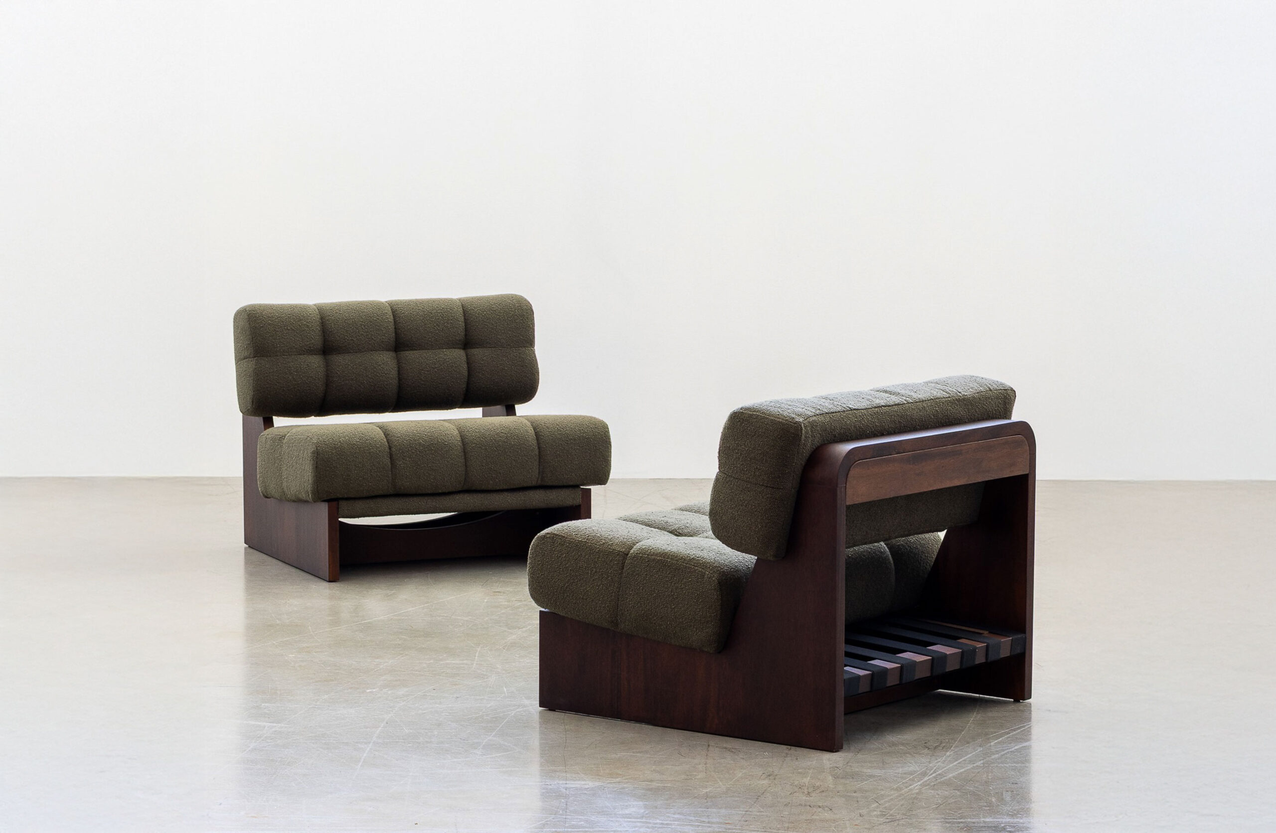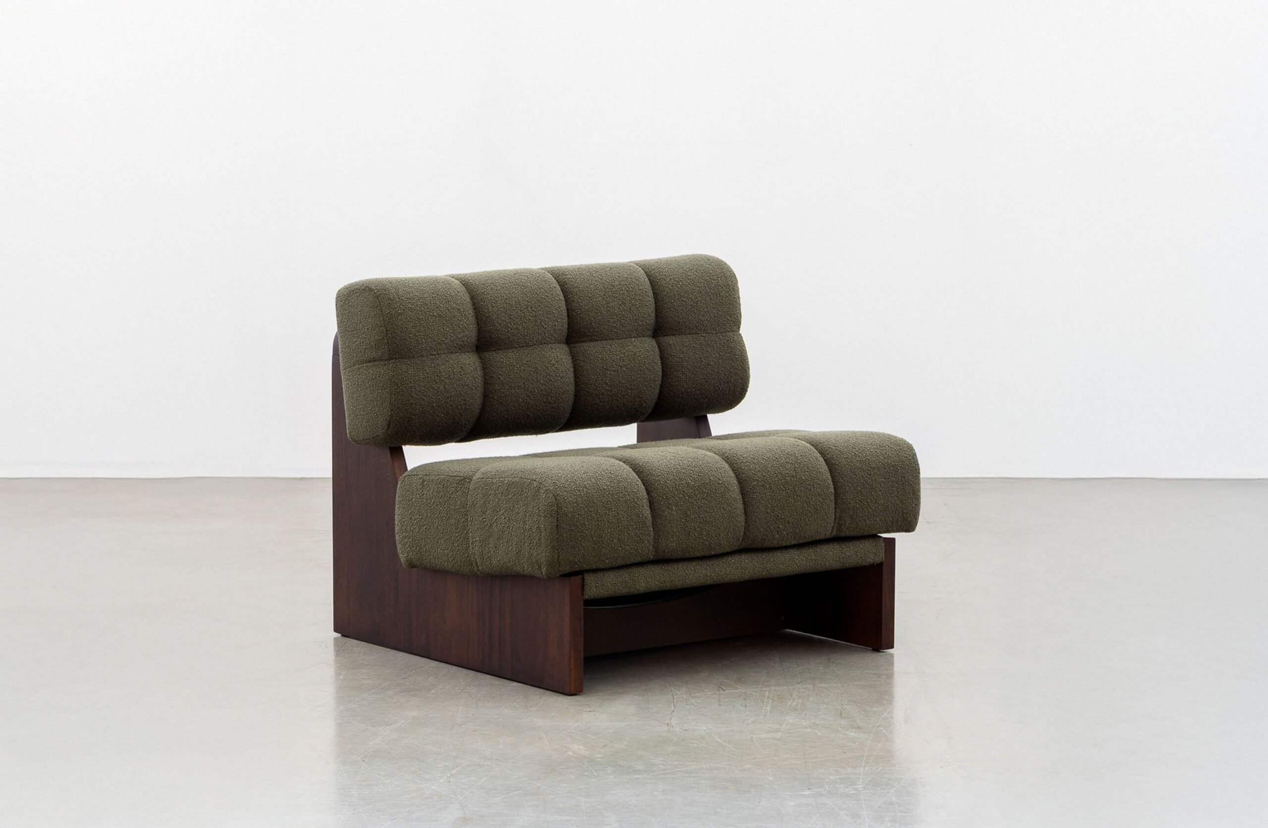 Com inspiração na solidez das formas arquitetônicas, a poltrona Granito combina robustez e suavidade em um desenho preciso e atemporal. Sua estrutura é feita em madeira de lypitus, com acabamento escuro que destaca os veios naturais e confere presença marcante à peça. O estofamento em tecido bouclé, de textura rica e toque macio, contrasta com a base rígida e adiciona conforto visual. O encosto e o assento generosos são marcados por gomos sutis, reforçando o volume e o aconchego da composição. As cintas elásticas visíveis sob o assento revelam a honestidade construtiva do projeto, unindo função e estética. Granito é uma poltrona de caráter, que se destaca pelo equilíbrio entre materiais naturais, formas puras e detalhes cuidadosamente executados. Disponível em tamanho único com múltiplos acabamentos.
